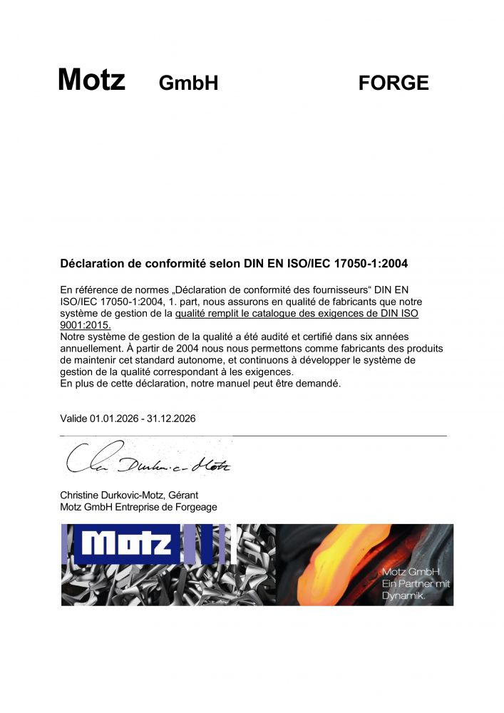 La vie d'une pièce forgée Motz - de la conception à la livraison - est suivie grâce à un sytème de gestion de la Qualité conformément à la norme DIN EN ISO 9001. Un personnel formé et expérimenté, des installations de production modernes et un système complet de gestion de la qualité permettent de satisfaire de façon fiable, les attentes élevées concernant la qualité de nos produits et nos services.