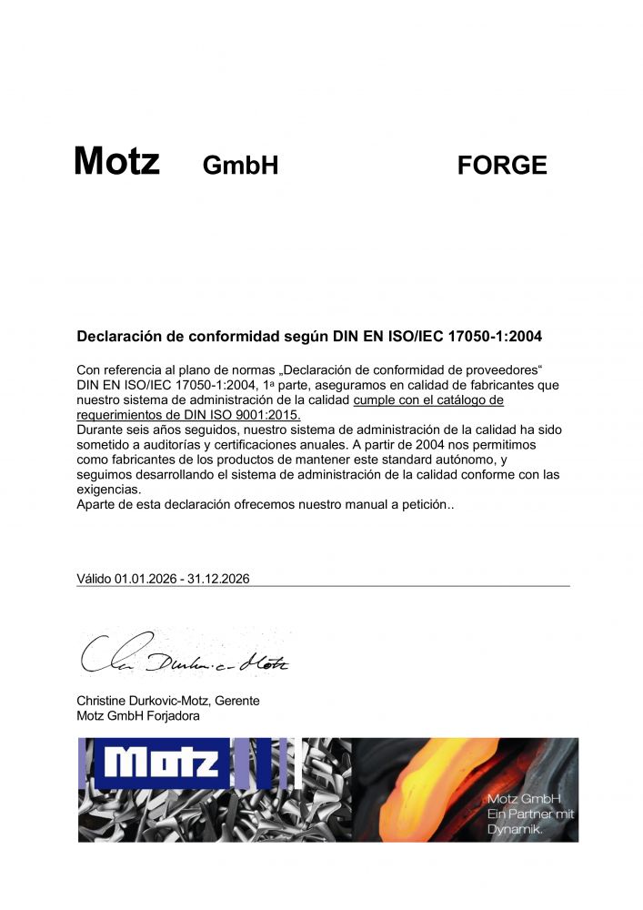 Todos los pasos de la producción de nuestras piezas, desde el diseño hasta el despacho están organizados y registrados de acuerdo al Sistema de manejo de calidad DIN EN ISO 9001. Personal capacitado y con experiencia, unidades de producción modernas y el sistema integrado de Control de Calidad garantizan que los altos requerimientos a nuestra calidad, ya sea para los productos y para los servicios de producción, se alcanzen siempre.